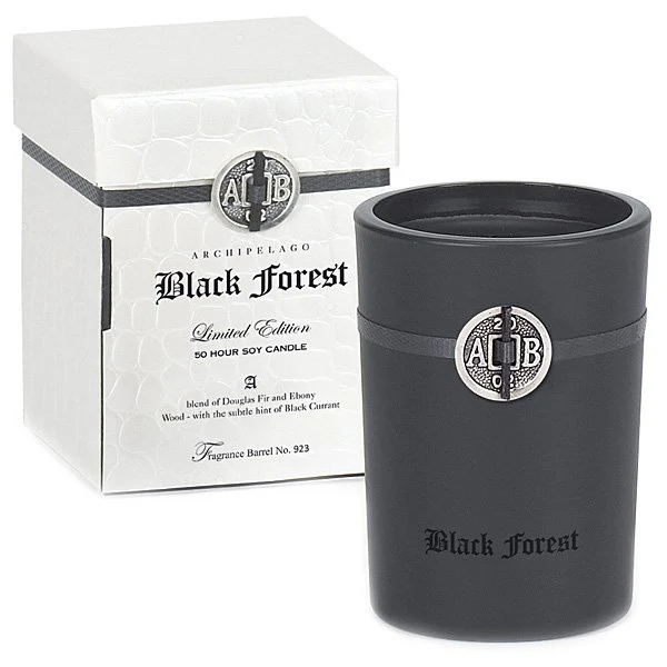 Archipelago Black Forest Candle is a sophisticated, woody scent, comprised of a blend of Douglas fir, ebony wood and a subtle hint of black currant. Poured into a special black matte-finish vessel.