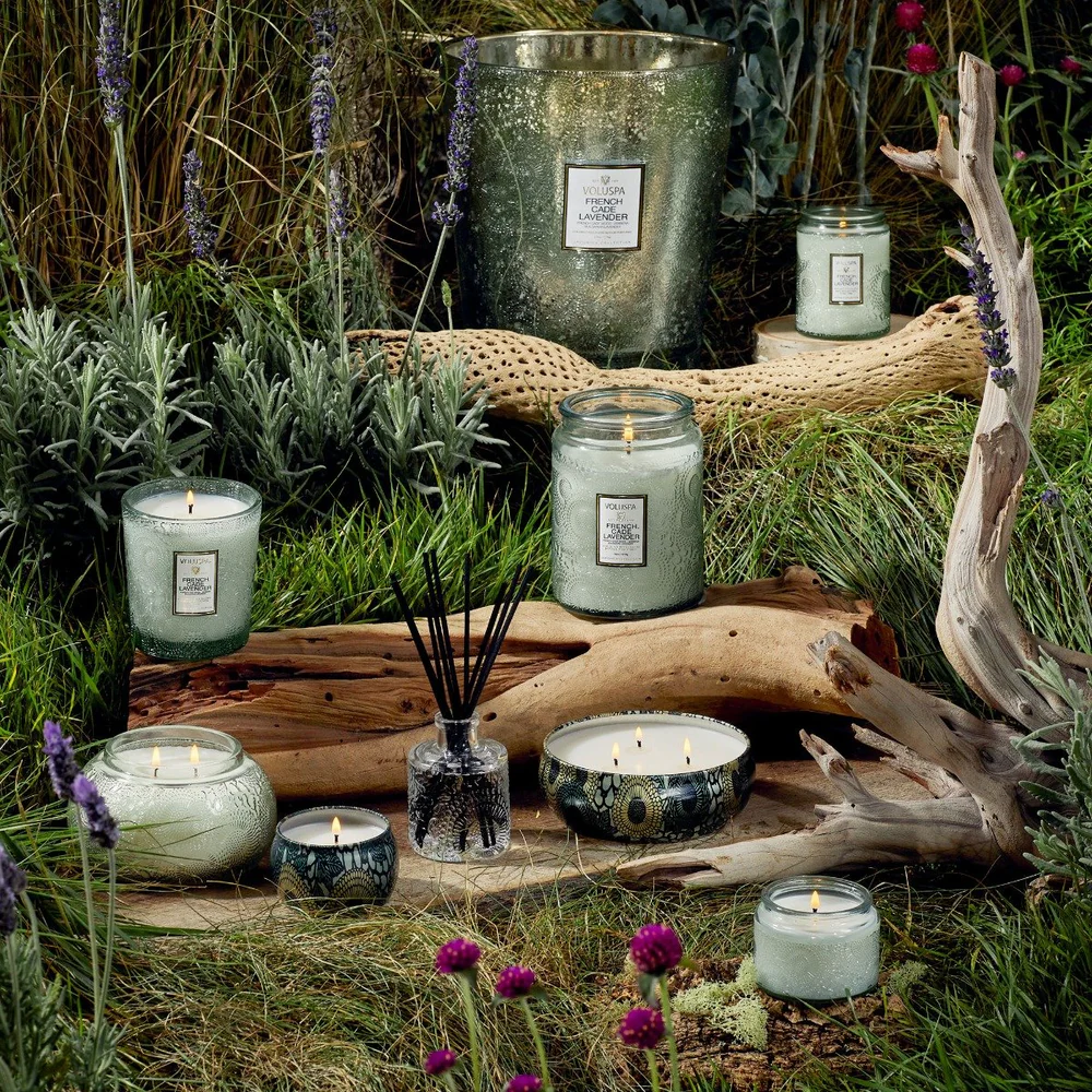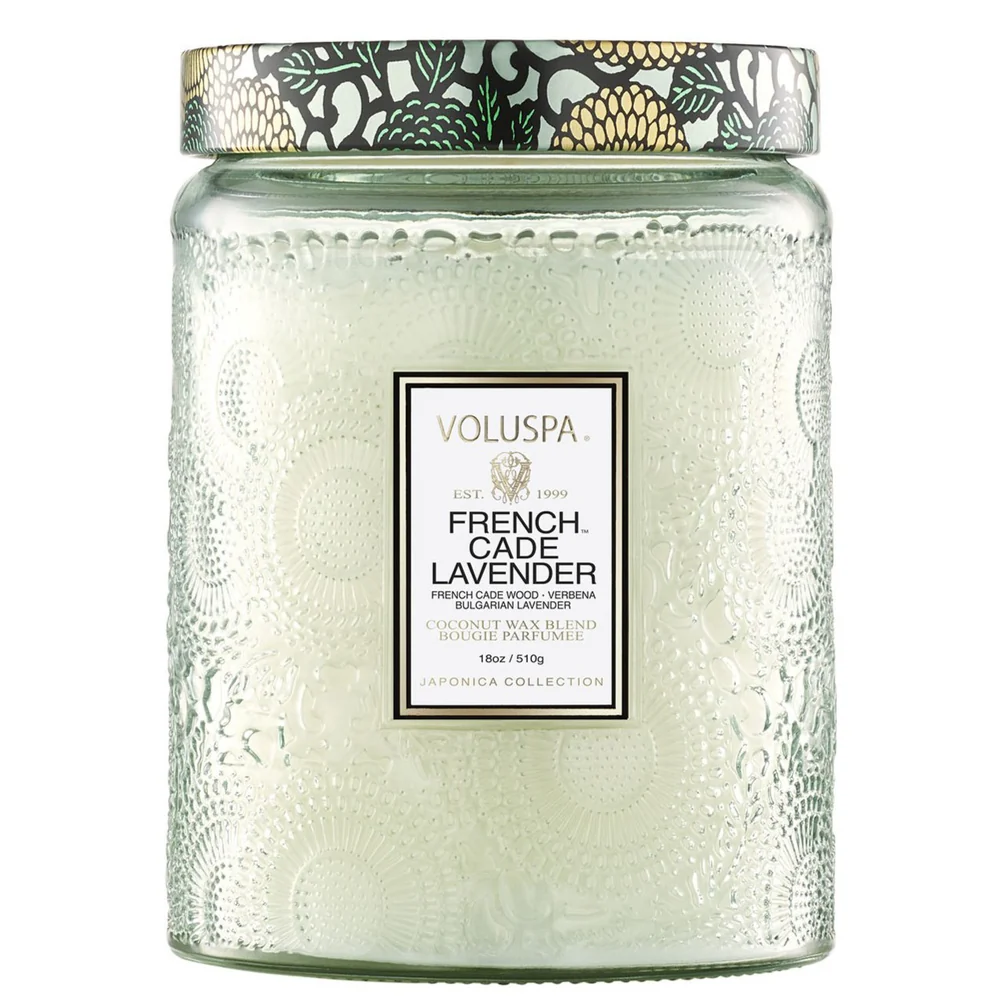 Voluspa Large Glass Jar Candles are Voluspa’s signature candle for the Japonica collection, poured in a custom embossed glass with coordinating lid for use in extinguishing candle and keeping candle dust-free when not in use. Voluspa Candles are made with creamy coconut wax which enhances fragrance throw, burns ultra clean, with fragrance and candle light that delights the senses and adds luxe to everyday living. Voluspa Japonica Candle Collection pays homage to beautiful works of Japanese art. Delicate traditional Japanese floral designs applied to their most creative fragrance palette yet. Try a French Cade & Lavender Candle today.